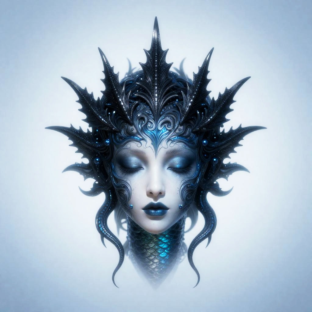 Digital art of a surreal mermaid-like female face with eyes closed, featuring intricate black and blue ornate patterns and a crown of sharp fish-like fins. The face has dark blue makeup and scales around the neck, set against a soft gradient blue and white background, creating a celestial and otherworldly gothic atmosphere.