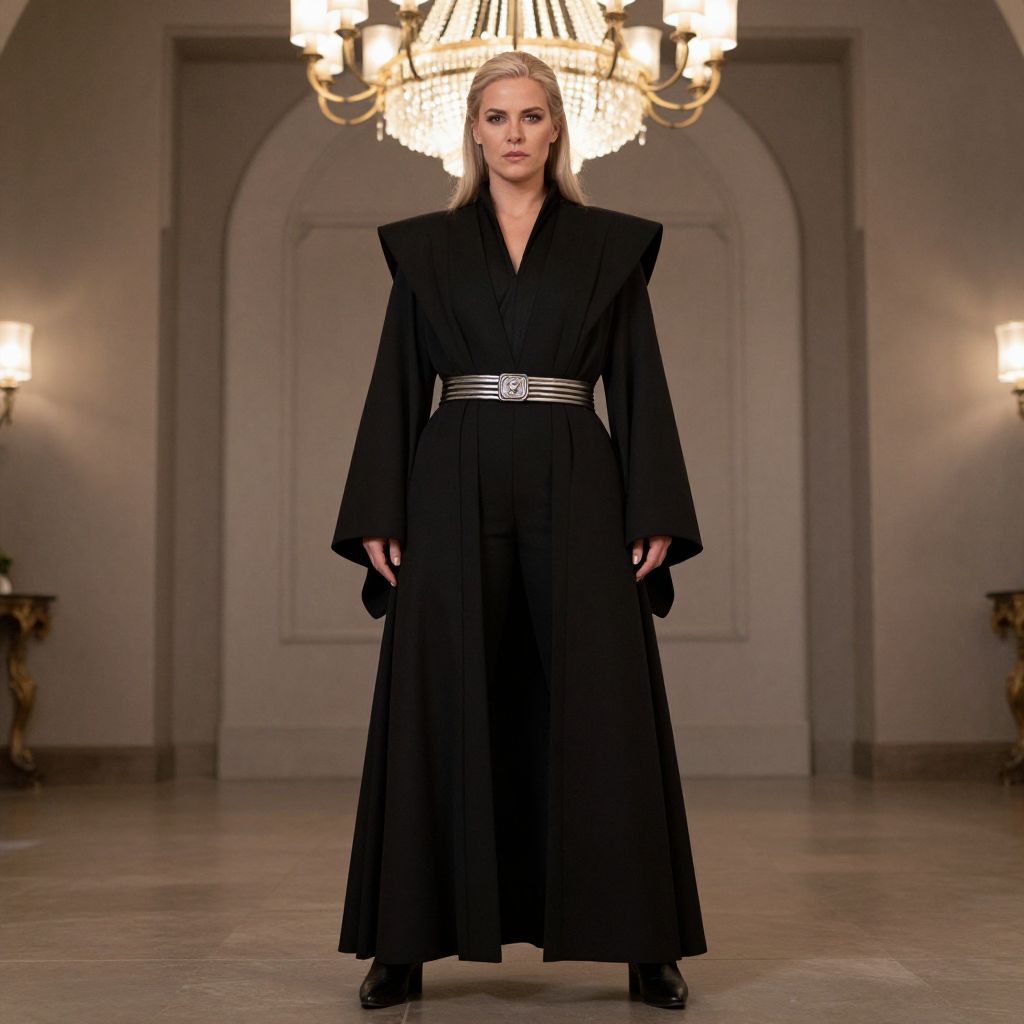 Photograph of a tall, slender Caucasian woman with straight, dark blonde hair, standing confidently in an elegant, dimly-lit room. She wears a long, black, floor-length dress with wide, flared sleeves and a high neckline, belted at the waist with a silver strip. Her expression is neutral, and she looks directly at the camera. Behind her, a grand chandelier with glowing, crystal-like lights illuminates the room, which has arched doorways and soft, warm lighting. The floor is polished marble, and there are small, ornate side tables on either side, adding to the sophisticated ambiance.