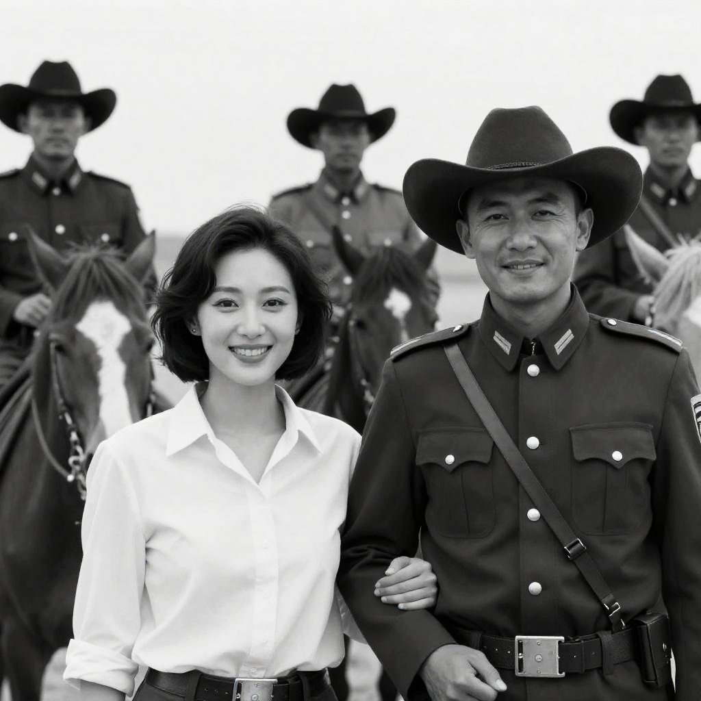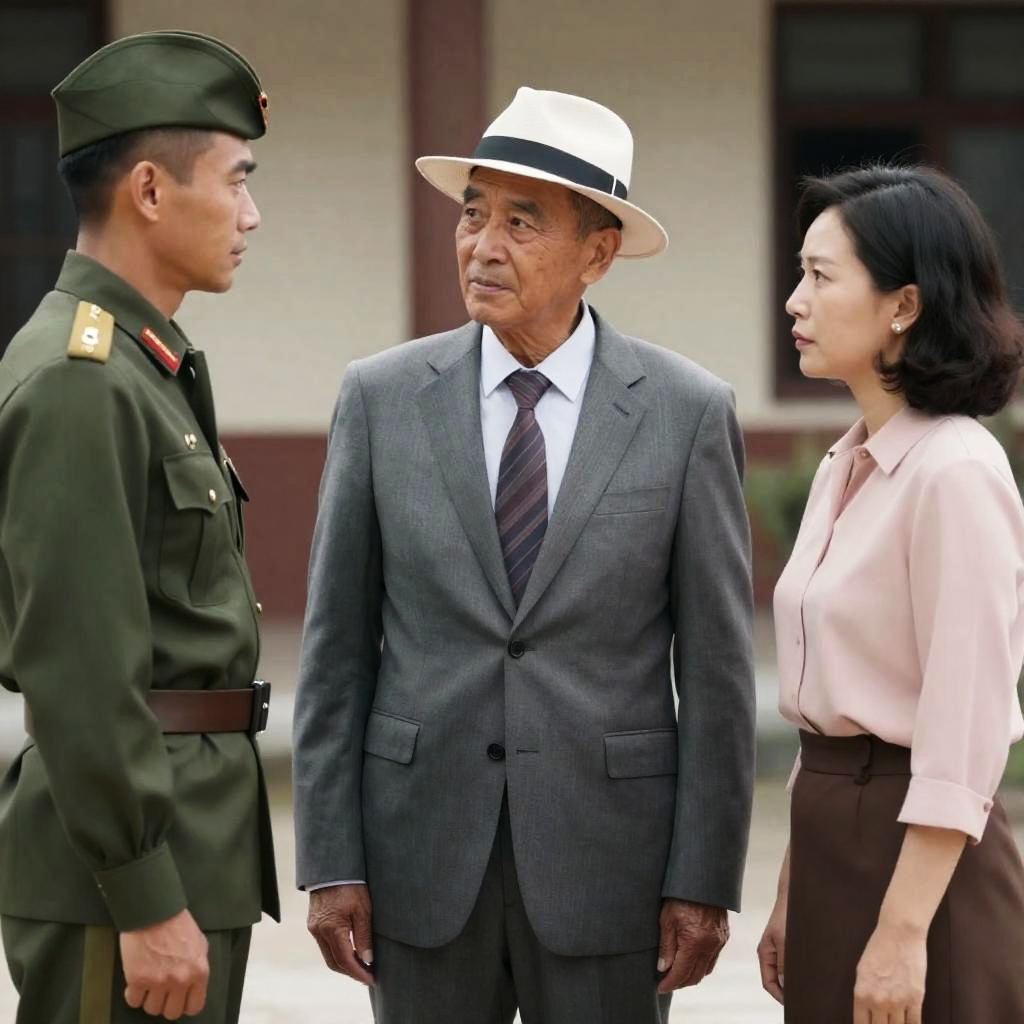 Vintage style image depicting three men dressed in dark green military uniforms with brown hats, interacting with a smiling woman wearing a pink blouse, blue skirt, and yellow necklace. The woman holds a woven basket while standing outdoors with rolling green hills in the background.