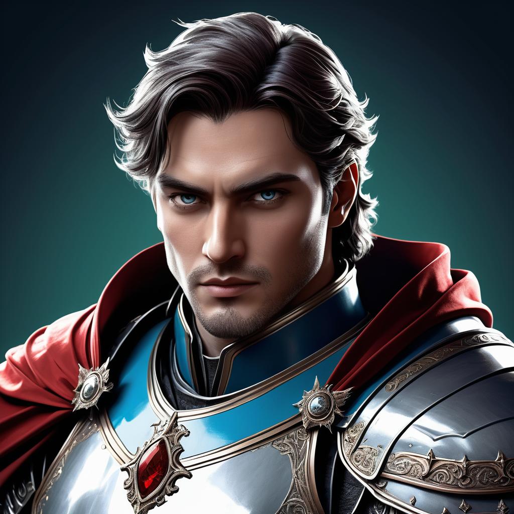 Highly detailed digital illustration of a fantasy knight with bright blue eyes and long flowing hair, wearing intricate silver and blue armor with ornate designs. The knight has a determined gaze and a deep red flowing cape, standing against a backdrop of a grand castle with soaring spires and an ethereal greenish sky. The composition features dramatic lighting and a mystical, heroic atmosphere, highlighting the shining armor and noble costume design.