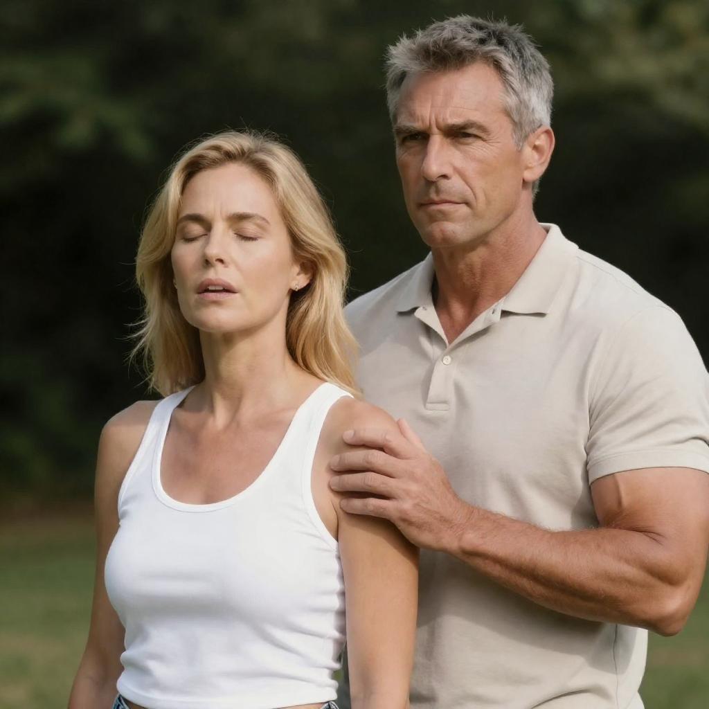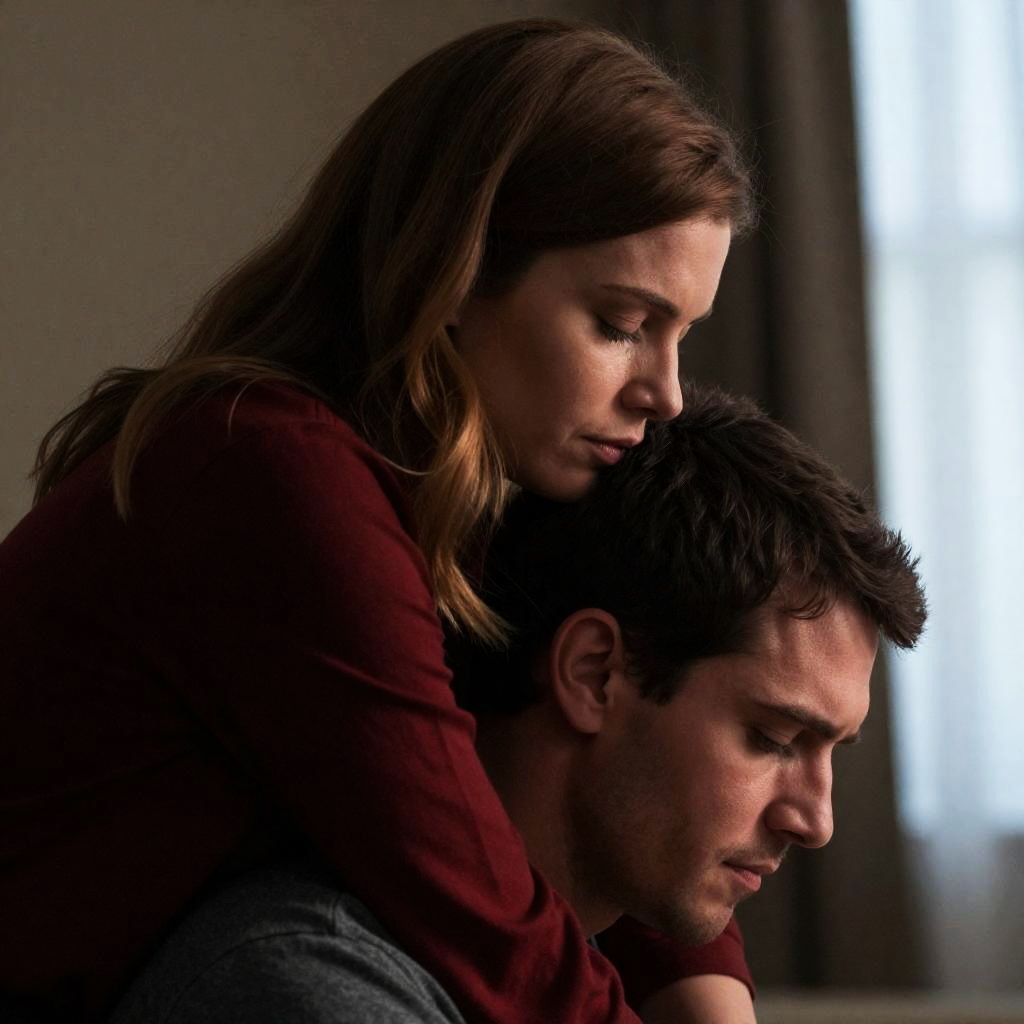 Shirtless, muscular man with injuries, leaning forward, grimacing. Blonde woman with shoulder-length hair, wearing light blue shirt and white pants, applying pressure to his back. Dimly lit, rustic room with stone wall, window with frosted glass, and bed with striped pillow. Intense expressions. Two people.