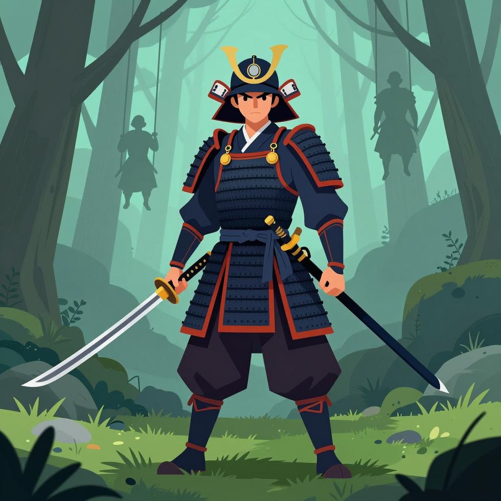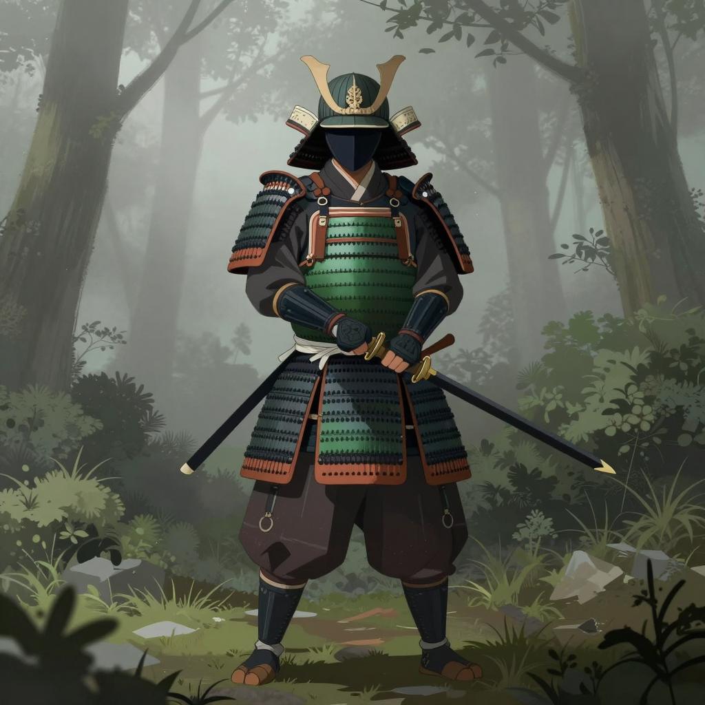 Illustration of a samurai in full armor standing in a misty forest. Samurai holds a sword in both hands, one over the right shoulder. Armor is detailed with green, black, and white patterns. Face obscured by a mask. Bushes and fog in the background. Samurai's stance is ready and alert. Grayish-green color palette. Dense foliage on the right side.