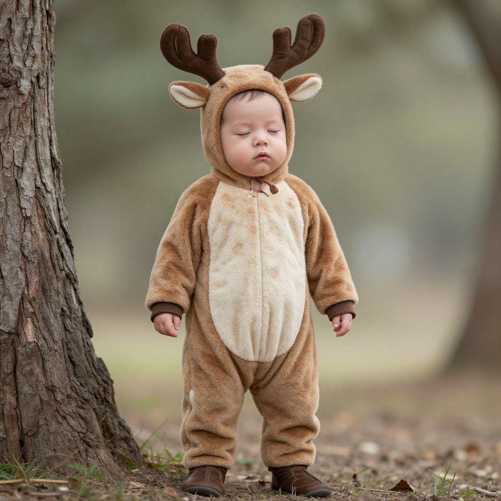 Photograph of a baby in a brown elf costume with pointy hat, white fur collar, and brown belt, standing on a park path with blurred