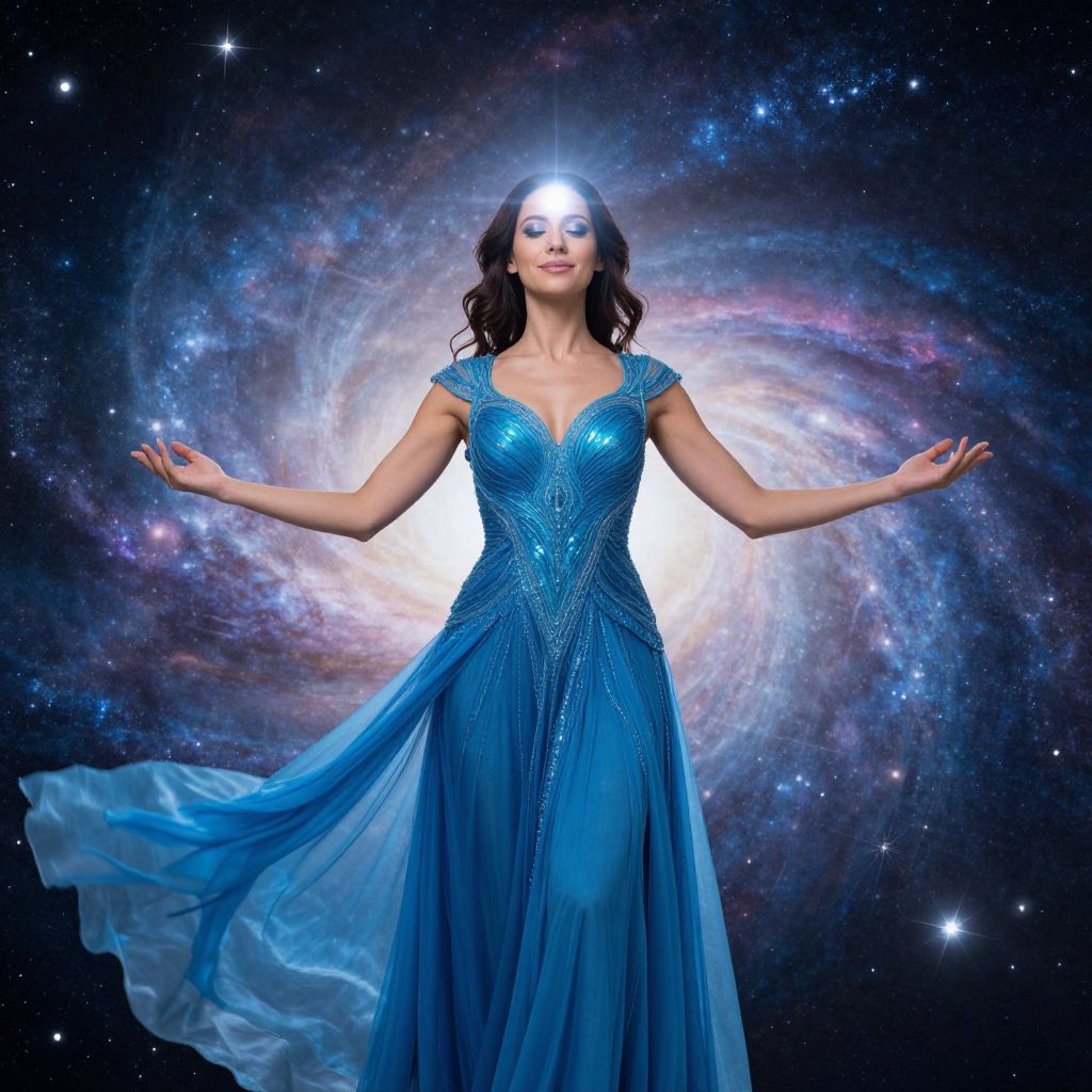 Photograph of a serene woman in a sparkling blue gown with a galaxy background, arms outstretched, glowing white light on her forehead.