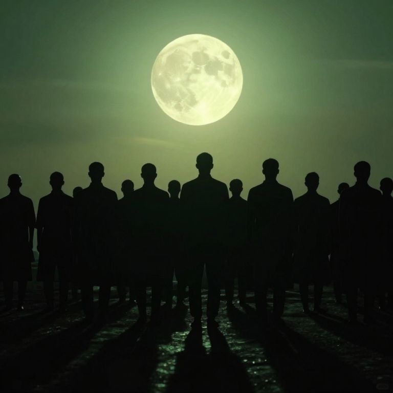 Silhouetted figures stand solemnly beneath a luminous greenish-yellow moon, their elongated forms casting eerie reflections on the ground as they gather in a haunting nocturnal procession.