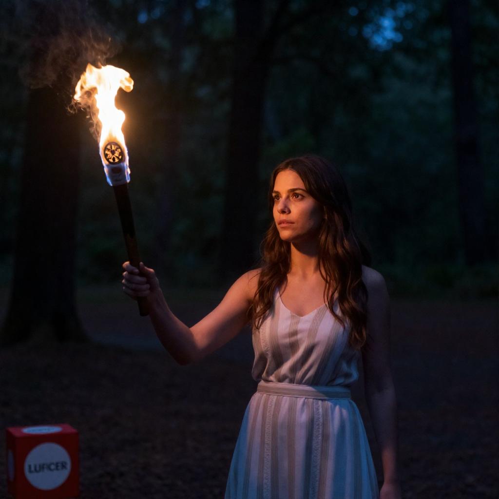 Photograph of a woman with long brown hair, wearing a white and beige striped dress, holding a flaming torch with a circular, fiery design. She stands in a dark, forested area with tall trees, illuminated by the torch's light. The ground is dark and ured. The bottom left corner has a red and white "Lucifer" box.