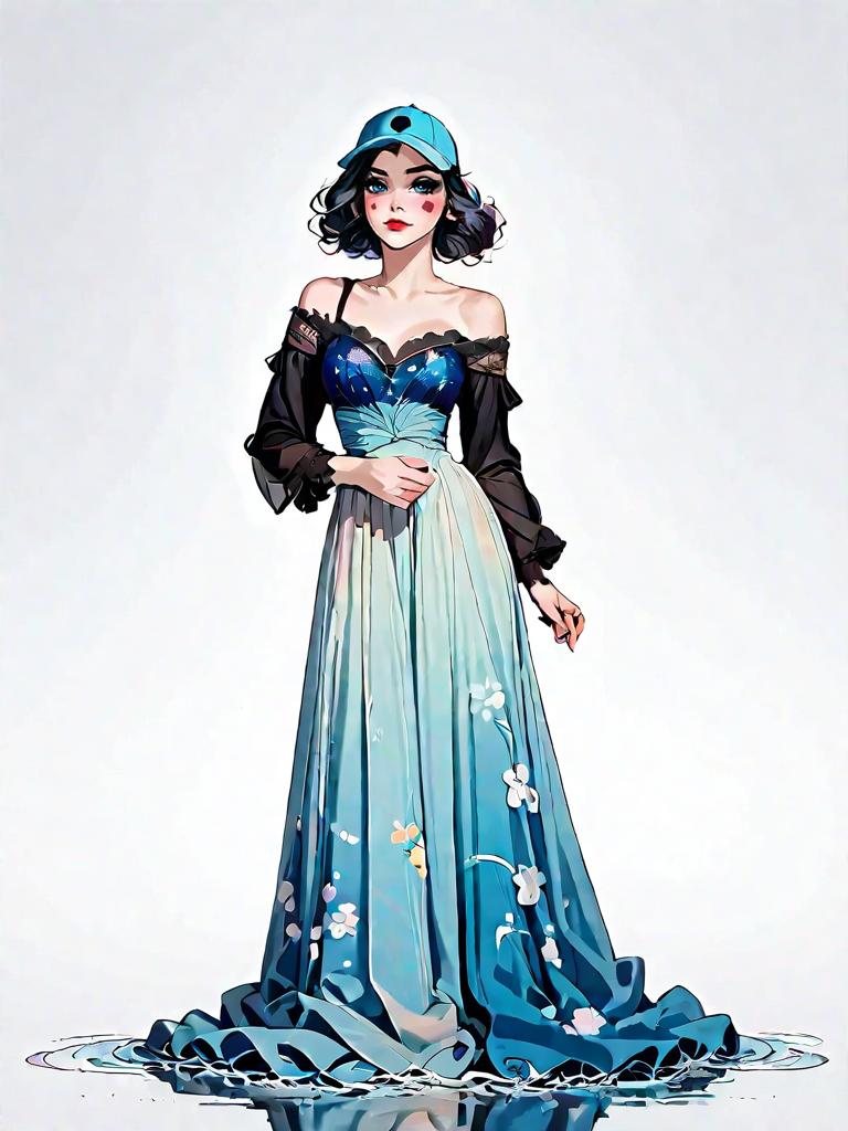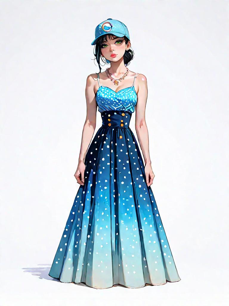 1girl, source_comics, realistic face, full body shot, Woman, casual summer, polka dot print mini dress, navy blue and white, thin spaghetti straps, scoop neckline, cinched elastic waist, flared skirt, short hemline, accessorized with a tan baseball cap, delicate layered necklaces, plain white wall background.