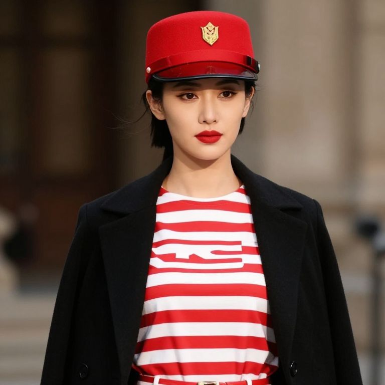 Female wearing a red and white striped outfit with a black jacket and a red hat with a gold emblem on it.