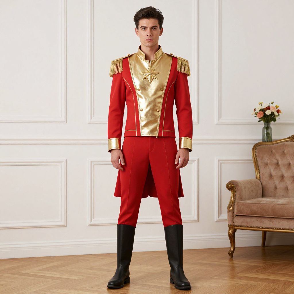 Photograph of a young man in a red and gold military-style uniform with black boots, standing in a white-paneled room with a beige armchair