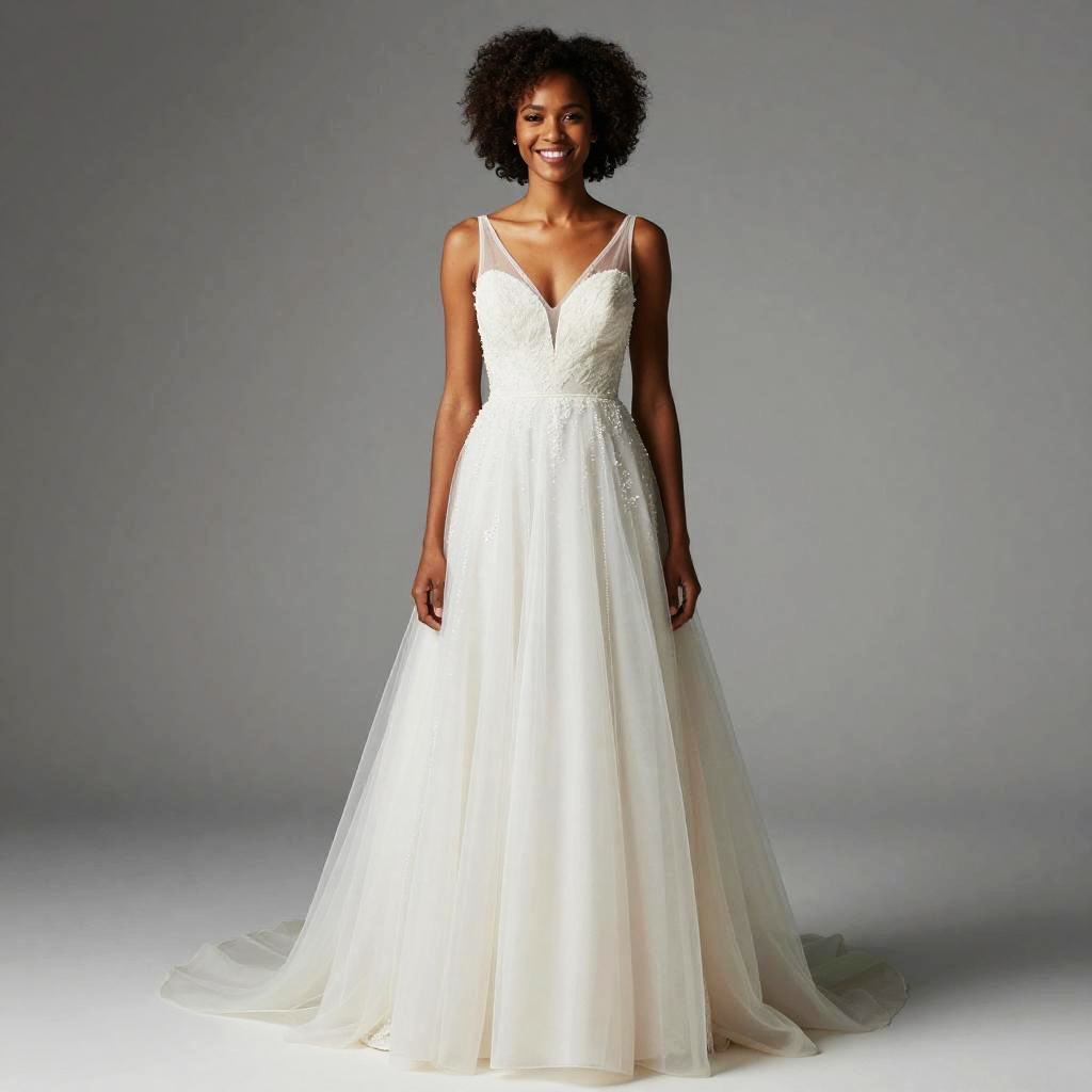 Photograph of a smiling African-American woman with a short, curly afro, standing against a plain gray background. She's wearing a white, sleeveless, V-neck, full-length wedding gown with a fitted bodice and a flowing, tulle skirt that has a subtle train. The dress has delicate, sheer straps and a subtle, textured pattern on the bodice. She exudes elegance and confidence.