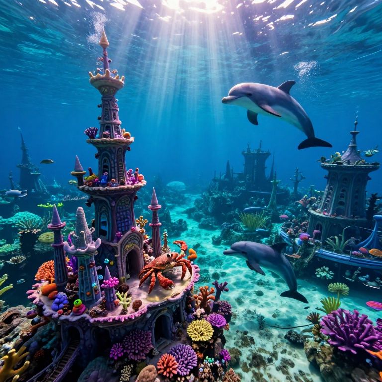 An aerial perspective unveils a bustling underwater metropolis at twilight, characterized by the vivid and intense colors reminiscent of Hokusai's artistry. Graceful koi fish weave through luminous coral labyrinths, their scales gleaming with radiant hues that mirror the gentle rays of sunlight piercing from above. This dynamic cityscape is teeming with aquatic life engaging in a harmonious dance around organic architectural marvels, instilling a profound sense of fascination and admiration for nature's splendor and its portrayal of time's passage.