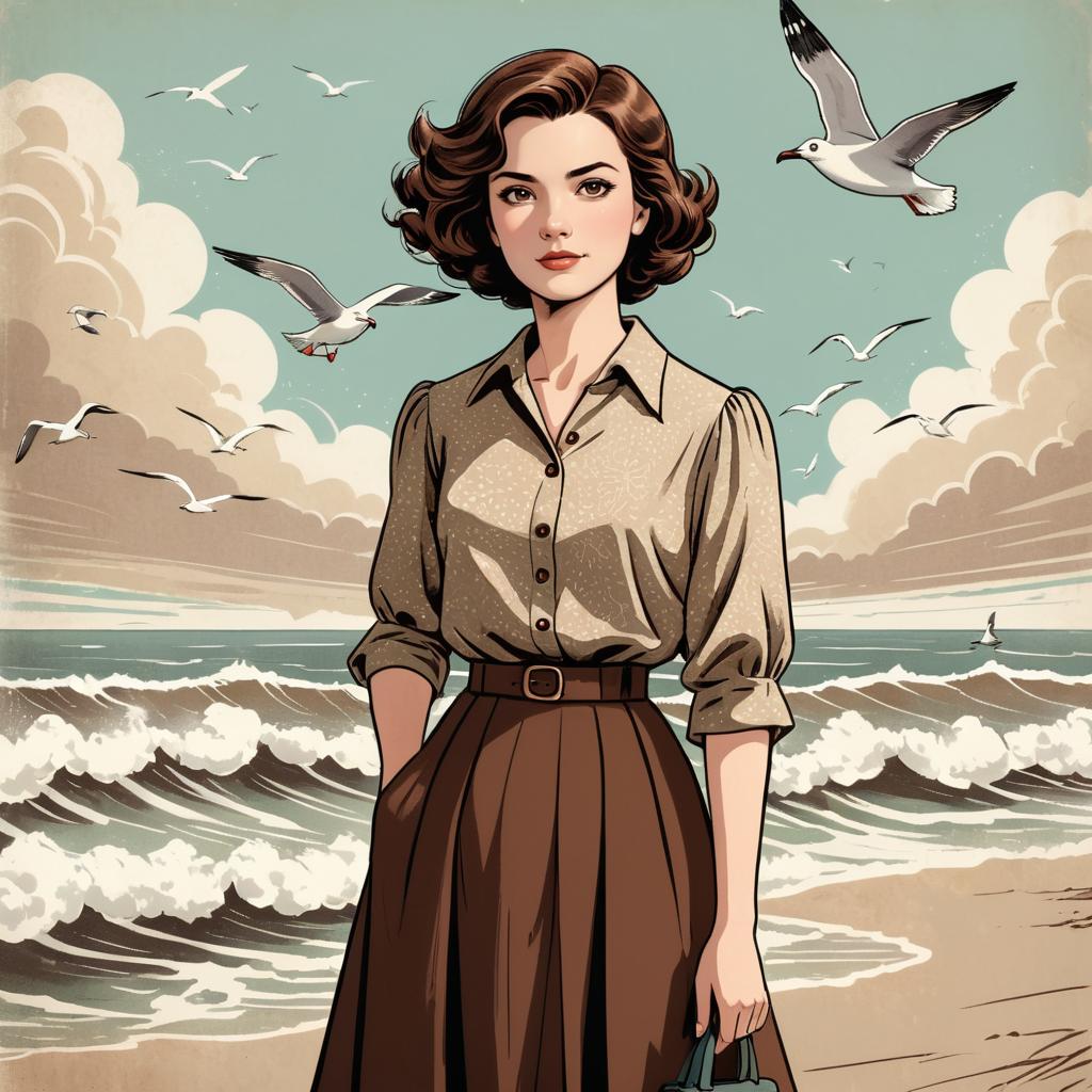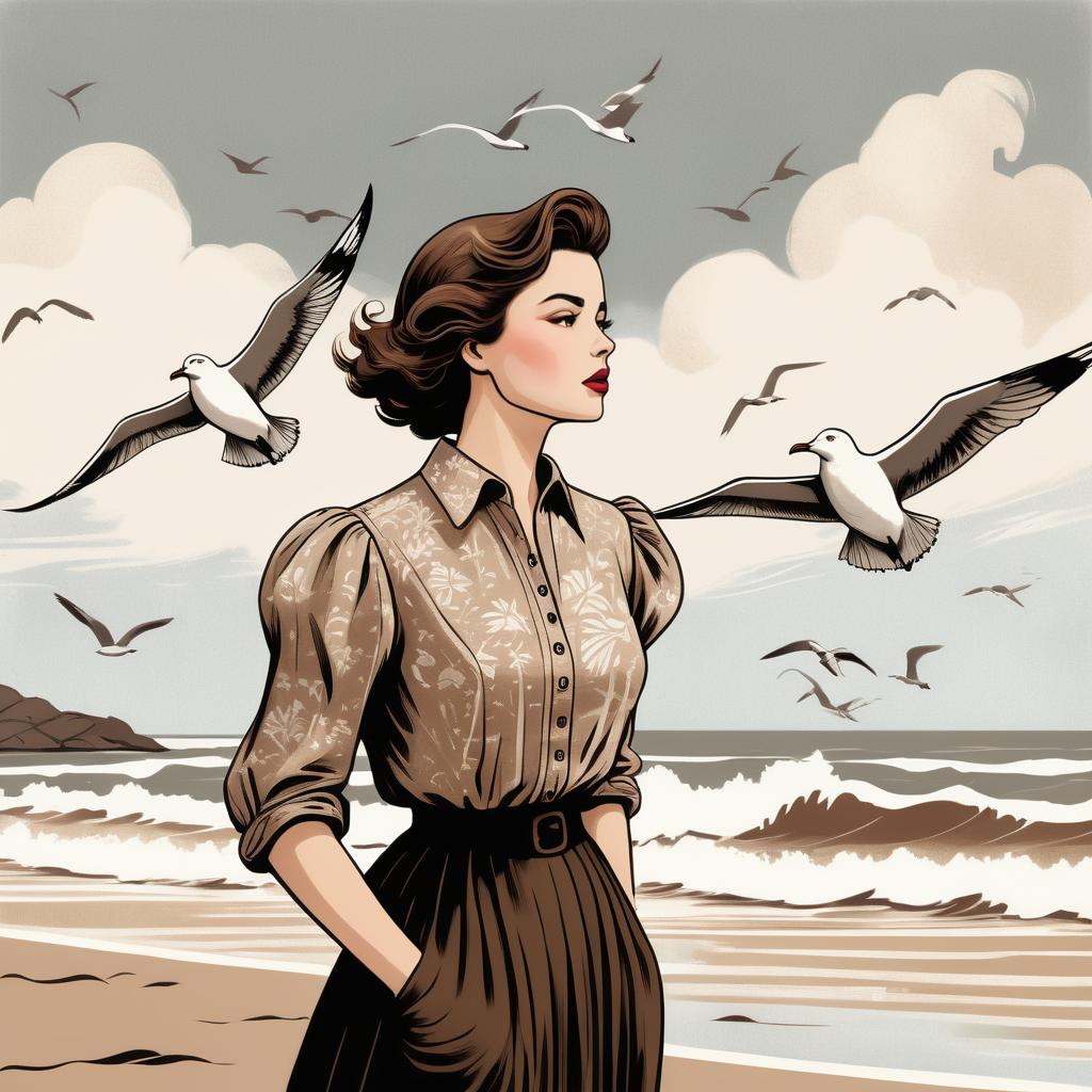 Illustration of a vintage style woman standing on a beach with seagulls flying around her. She wears a beige polka dot blouse and a brown skirt with a belt, looking contemplatively toward the horizon with the sea and waves in the background.