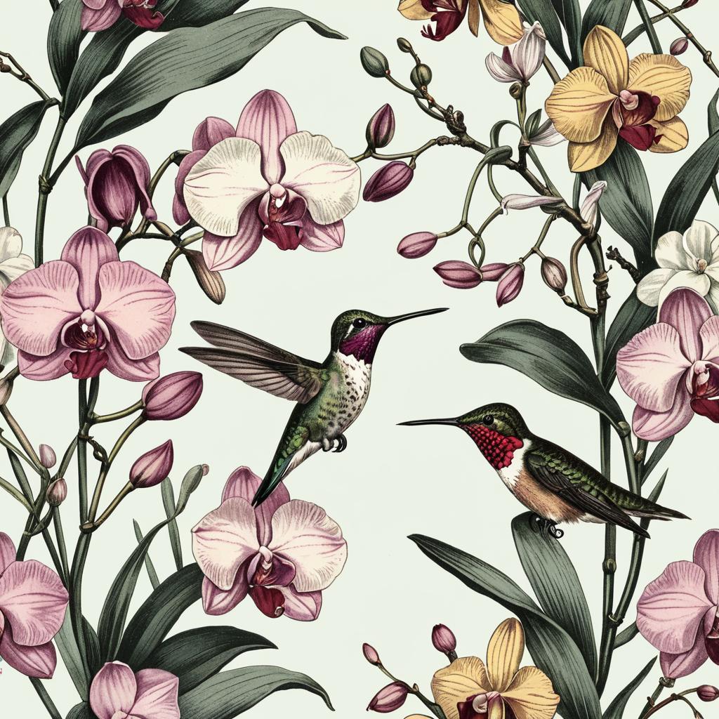 Hand-drawn vintage style illustration featuring a garden of orchids in muted pastel shades, accompanied by hummingbirds. The artwork showcases various detailed orchid flowers in pink, white, and yellow tones with green foliage, designed to be repeatable for wallpaper patterns.
