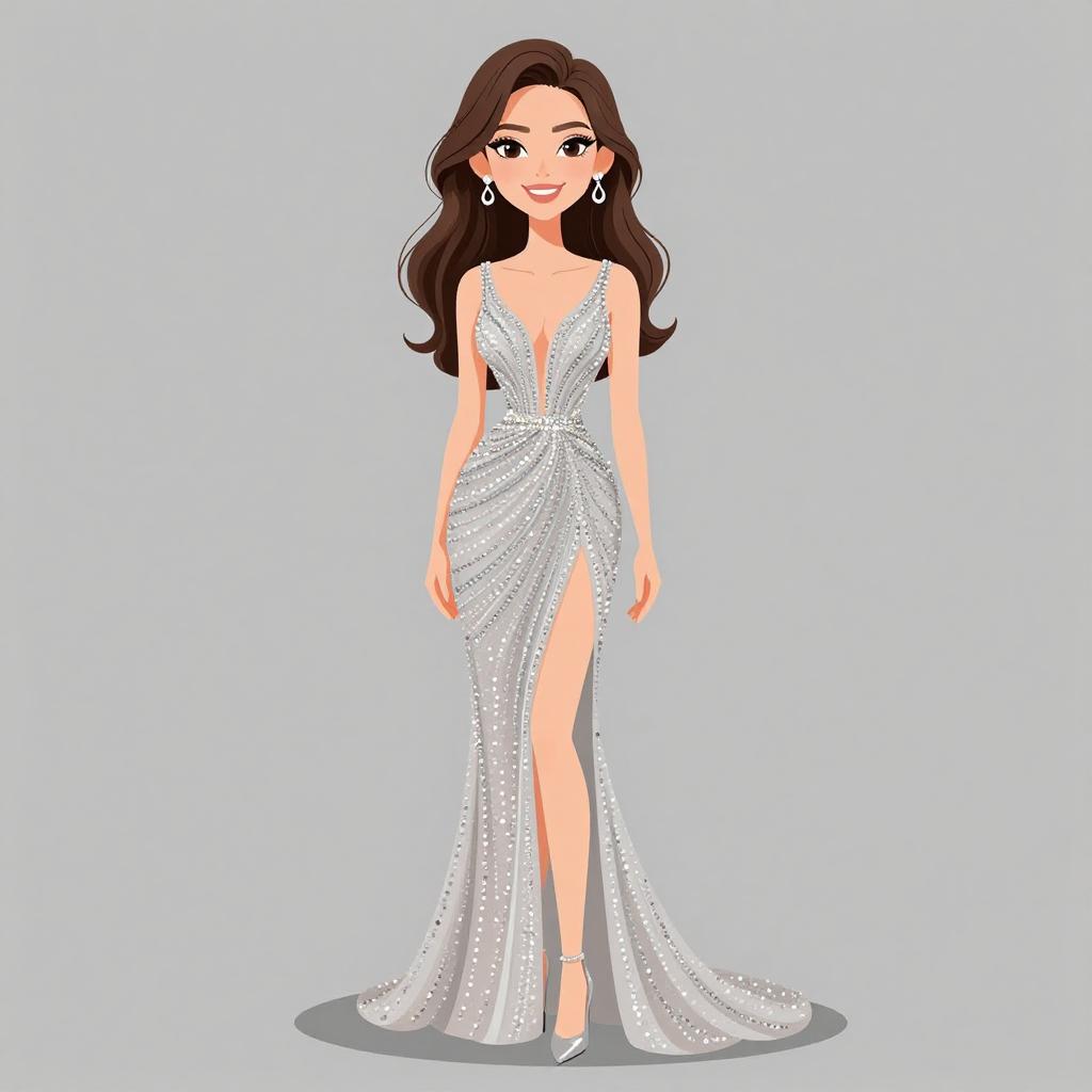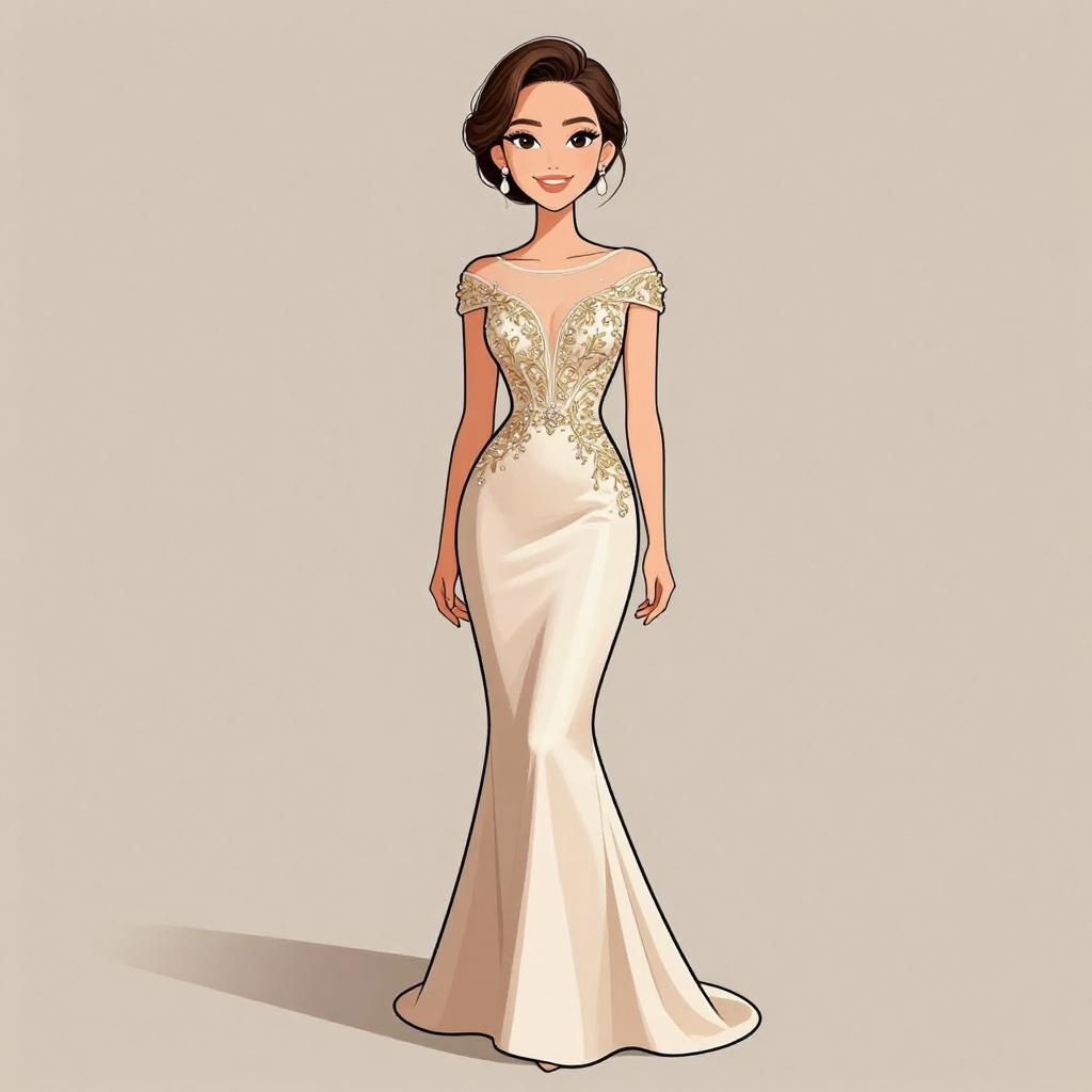 Woman with pretty face and pretty hair. smiling Woman, classic elegance, off-the-shoulder lace gown in ivory, sweetheart neckline, form-fitting silhouette, three-quarter length sleeves, floral lace overlay, thigh-high slit, crystal embellished waist accent, floor-length, nude pointed-toe heels, delicate pendant necklace, minimalist backdrop --sref 1467