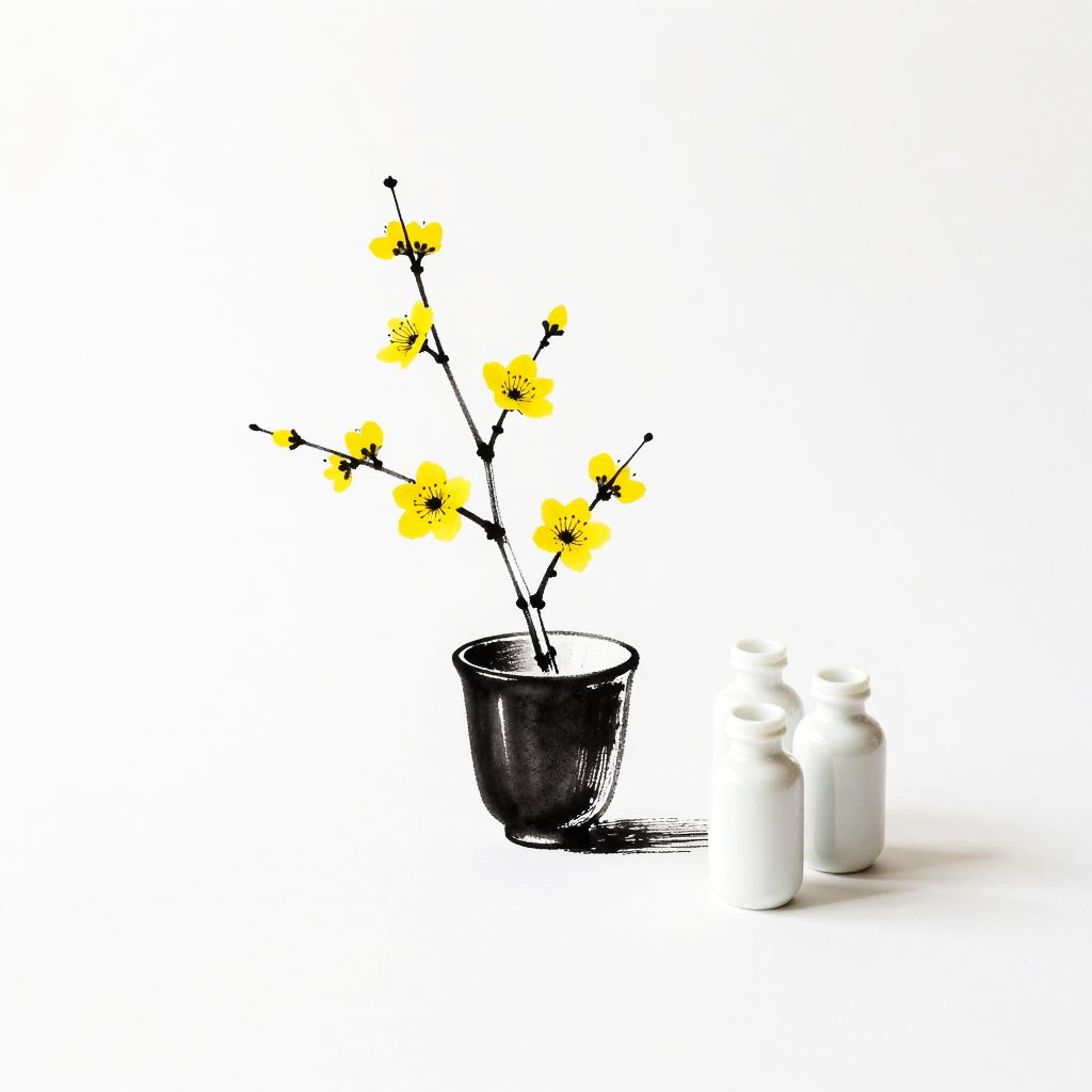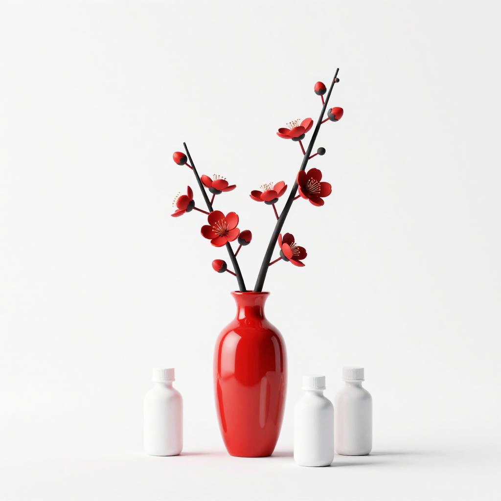 A hyper-clean 3D render featuring a glossy red vase holding a thin black branch with crimson flowers, on a seamless white background with three small empty white bottles nearby; high contrast, bold accent colors, thin clean lines, balanced composition, generous negative space, soft studio lighting, modern minimalist aesthetic, crisp edges, no text, no watermark