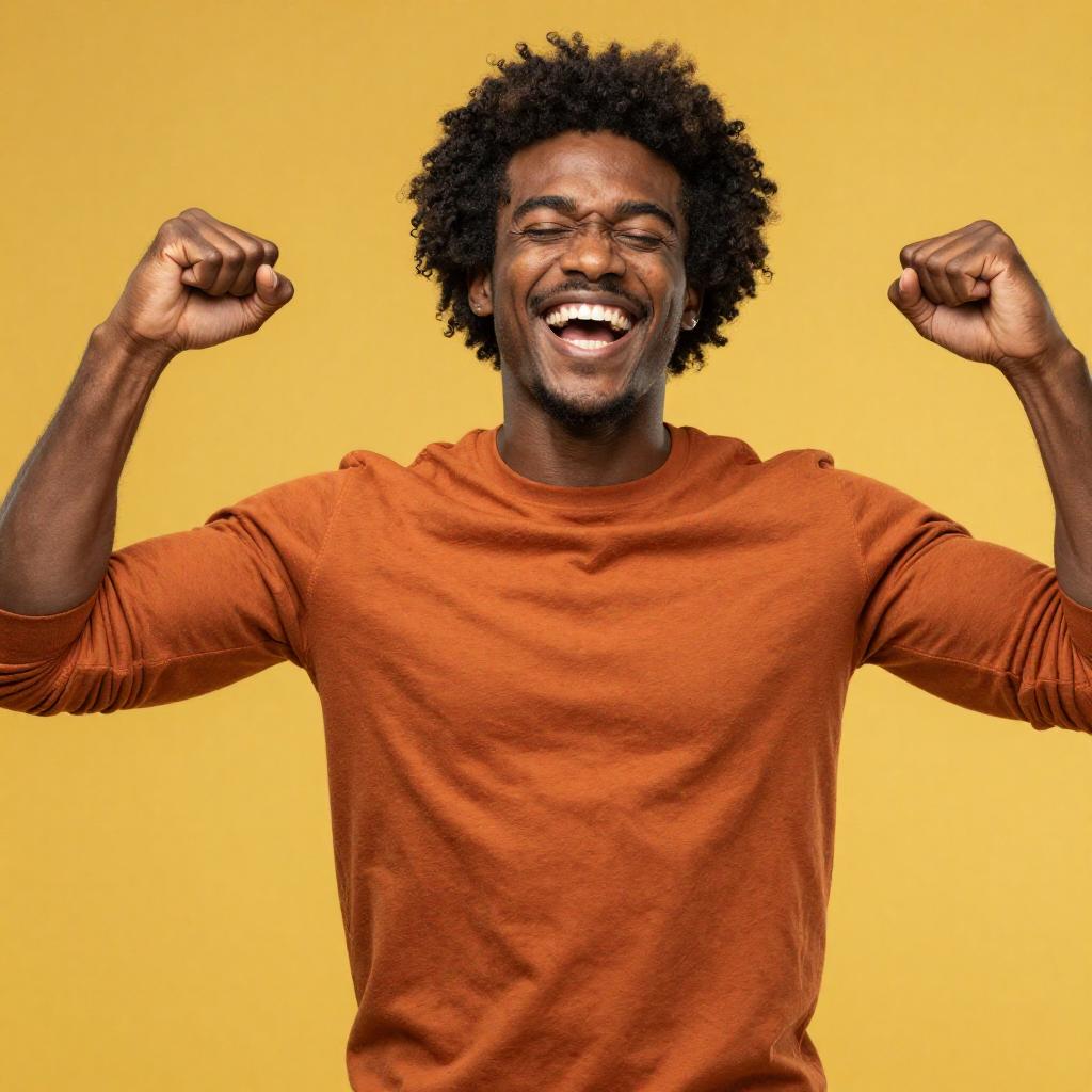 Photograph of a happy, muscular black man with short, curly black hair, smiling widely with eyes closed. He's wearing an orange long-sleeve shirt, standing against a bright yellow background. His arms are raised and fists are clenched in a celebratory pose. The vibrant colors and his confident expression create a lively, energetic vibe.