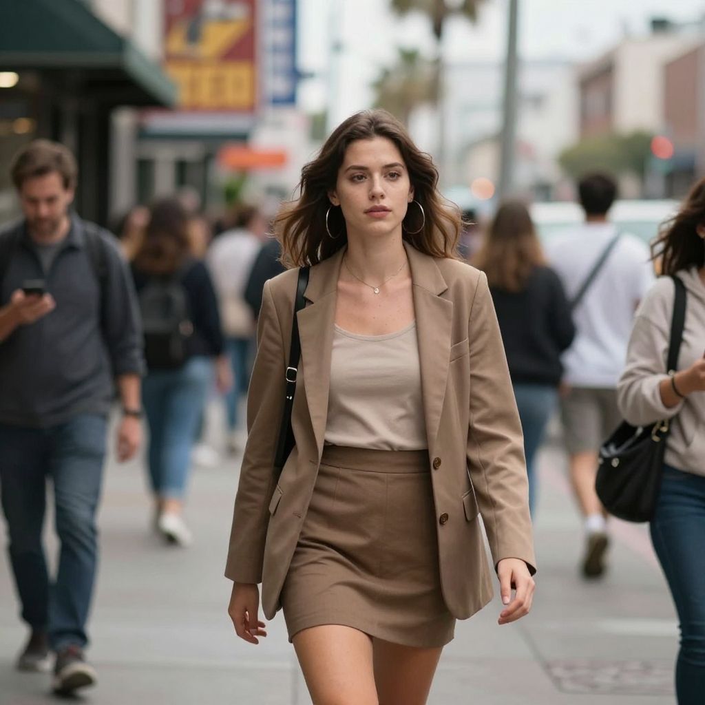 Photograph of a young woman walking confidently in a bustling urban street. She has fair skin, dark brown wavy hair, and wears a beige blazer over a cream tank top, paired with a matching beige mini-skirt. She carries a black shoulder bag and sports large hoop earrings. The background is a blurred cityscape with pedestrians, buildings, and storefronts, including a colorful sign on the left. Her expression is serious, and the overall style is chic and modern. The scene is lively, with people walking in various directions.