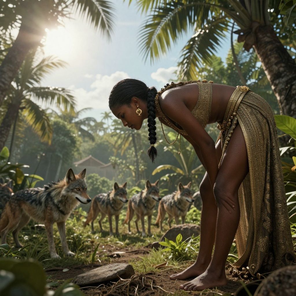 Photograph of a dark-skinned woman with long braided hair, wearing a gold, beaded, sleeveless top and skirt, bending forward in a sunlit tropical forest. She is barefoot, adorned with gold hoop earrings. In the background, a group of wild coyotes stands on a dirt path surrounded by lush greenery and palm trees. The sunlight filters through the trees, casting dappled shadows on the ground. The woman's focused gaze is directed at the coyotes, creating a sense of interaction between her and the animals. The overall composition highlights the natural, serene yet slightly tense atmosphere.