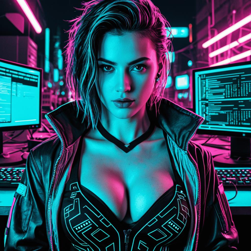 Coloring page of a cyberpunk female hacker, revealing cleavage, inspired by vaporwave aesthetics