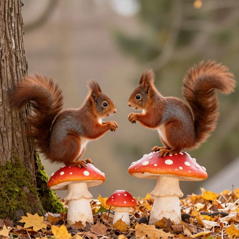 Photograph of two red squirrels with bushy tails standing on red, white-spotted mushrooms in a forest. The squirrels are facing each other, both with small paws raised as if eating. The background is blurred with tree trunks and autumn leaves. The mushrooms are centered, with one squirrel on each. The squirrels' fur is rich brown with a slightly glossy texture, and their eyes are bright. The autumn leaves are yellow and orange, scattered around the mushrooms, enhancing the seasonal feel. The overall scene is vibrant and whimsical.