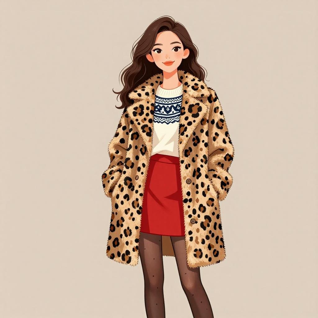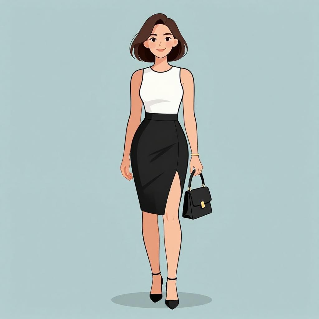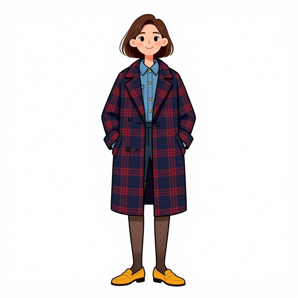 Woman with pretty face and pretty hair. smiling Woman, modern classic, houndstooth patterned coat in black and white, knee-length, notch lapel, open front, polka dot print top underneath, vibrant red A-line mini skirt, black ankle boots with heels, solid color, simple hair down and natural, plain white studio background. --sref 1467