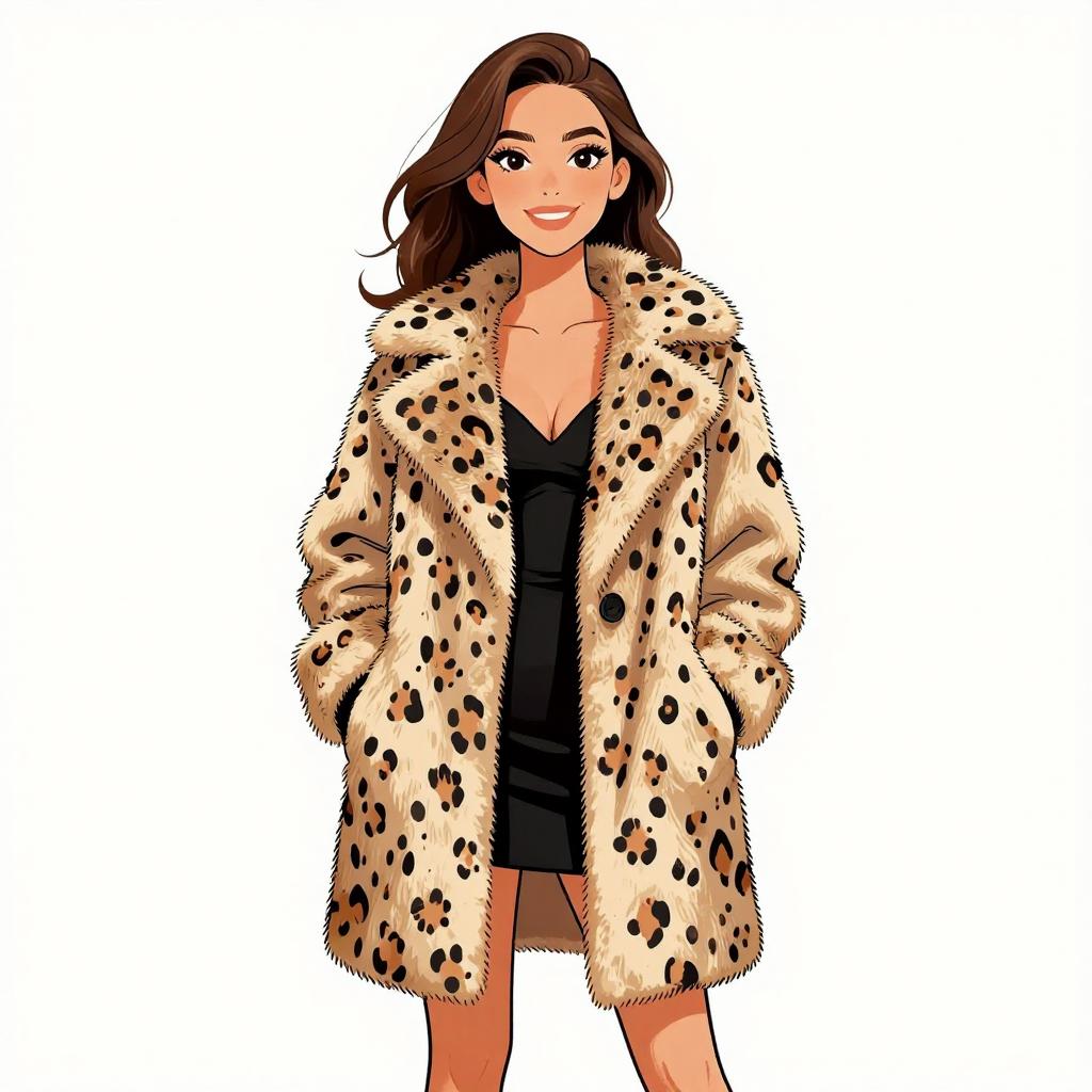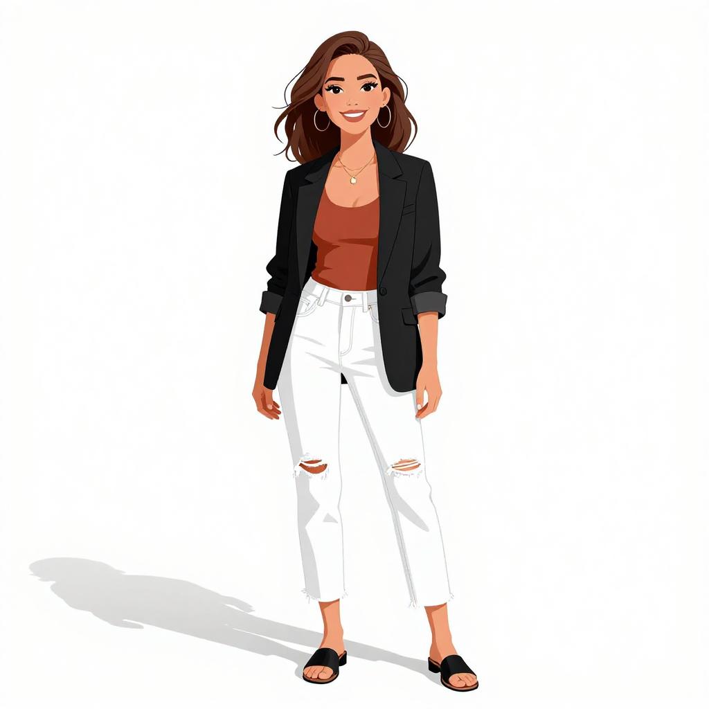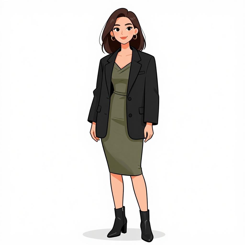 Woman with pretty face and pretty hair. smiling Woman, modern classic, houndstooth patterned coat in black and white, knee-length, notch lapel, open front, polka dot print top underneath, vibrant red A-line mini skirt, black ankle boots with heels, solid color, simple hair down and natural, plain white studio background. --sref 1467