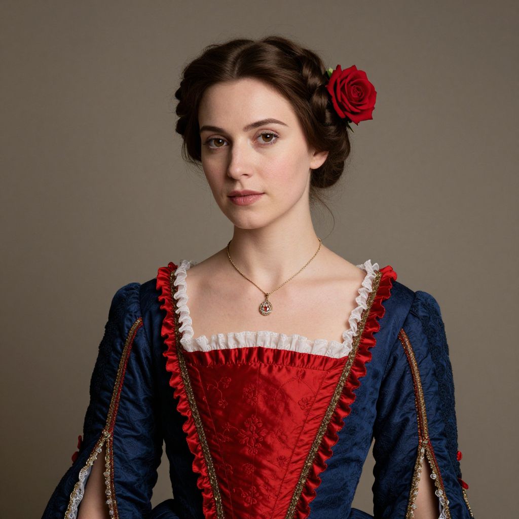 Elegant portrait featuring a woman in a Renaissance-inspired ensemble, characterized by a deep blue and vibrant red dress with intricate ruffled detailing, complemented by a delicate necklace and a single red rose adorning her neatly styled hair.