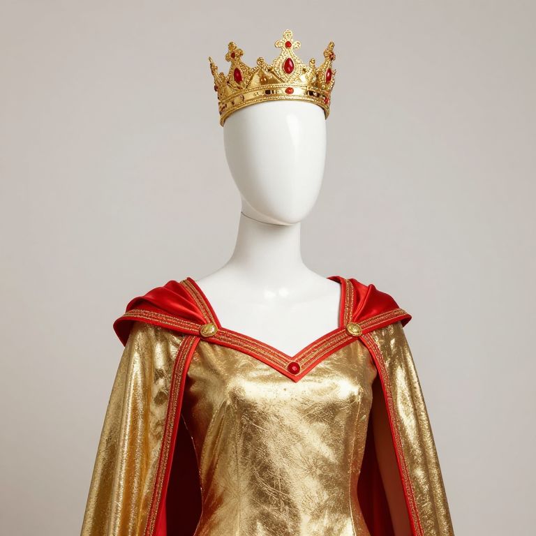Mannequin wearing a black and gold outfit with a crown on his head.