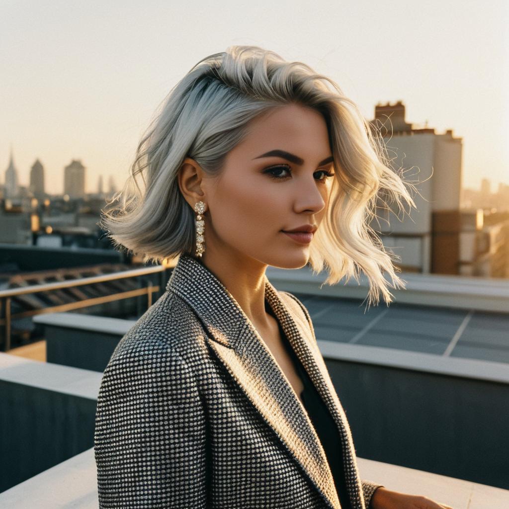 Portrait of a stylish young woman with platinum silver bob hairstyle wearing an elegant checkered blazer and statement earrings. She is standing on a rooftop terrace during golden hour, with a city skyline blurred in the background. The image captures a fashion editorial vibe with soft diffused lighting highlighting her makeup and hair.