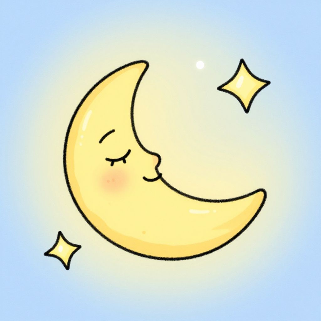 Simple moon drawing featuring a smiling crescent moon with closed eyes, surrounded by a few playful stars, warm yellow and soft blue hues, childlike whimsical style with smooth lines and bright highlights, ideal for storybook illustration.