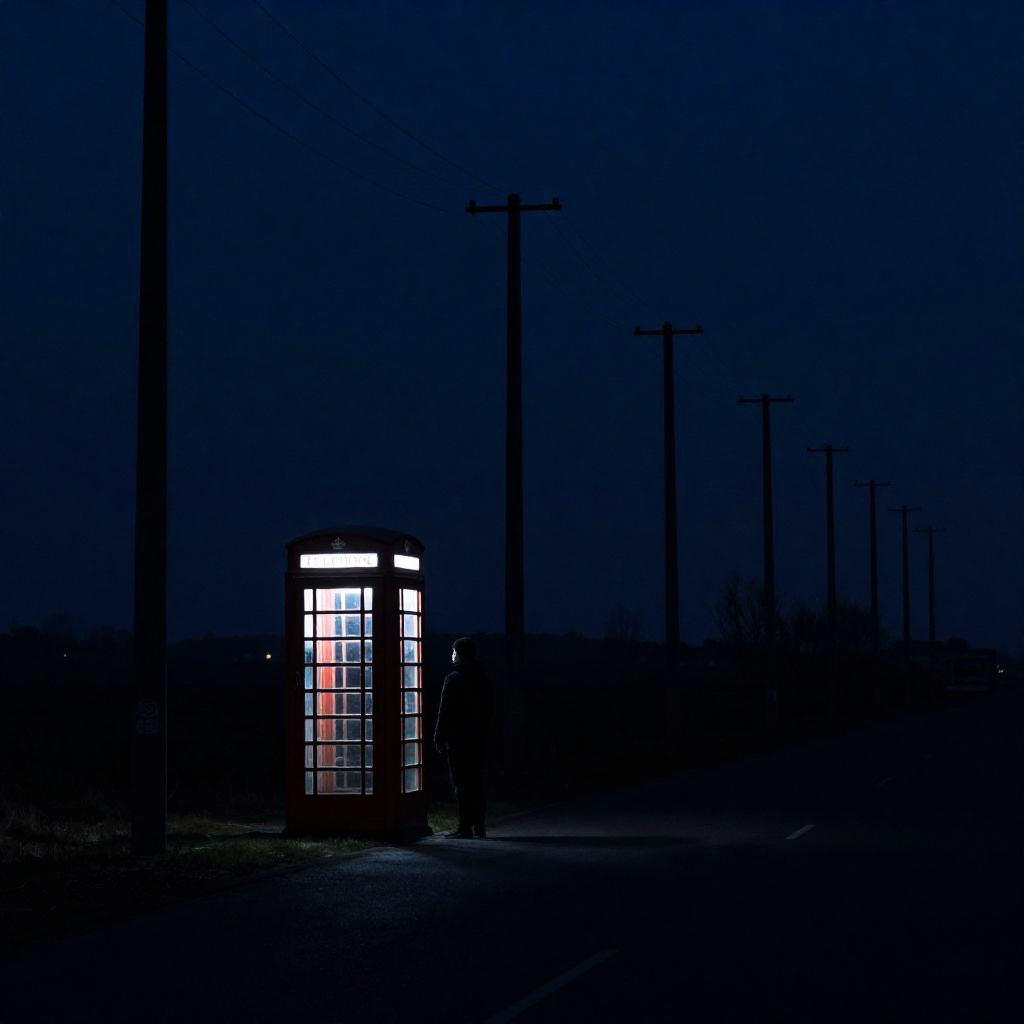 A person stands near a brightly lit red telephone booth on a dark, deserted road at night. A row of tall electrical poles extends into the distance under a deep blue sky, creating strong silhouettes. The scene has a minimalistic and moody atmosphere with cool color tones and cinematic lighting.