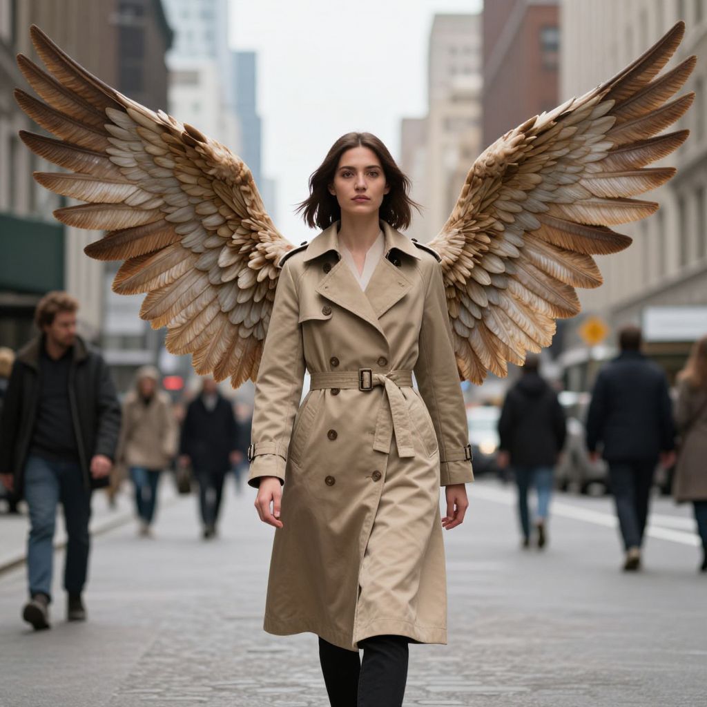 In a surreal digital artwork, a woman dons a trench coat adorned with lifelike wings that extend dramatically against the backdrop of a bustling urban street, blending realism with fantastical elements in a high-definition, computer-generated composition.
