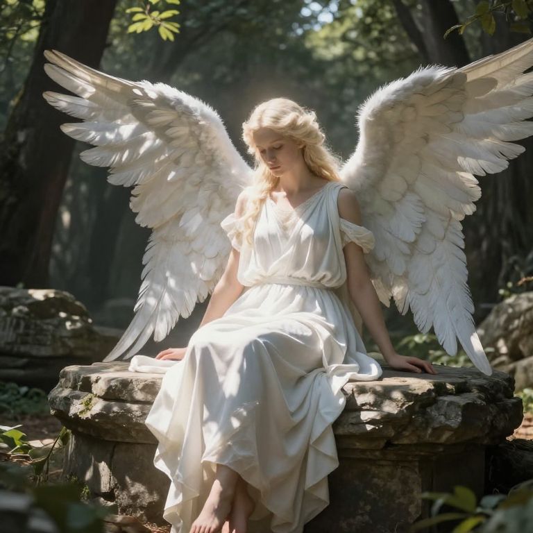 Photograph of a blonde, angelic woman with large white wings, wearing a flowing white dress, sitting on a sunlit stone bench in a forest