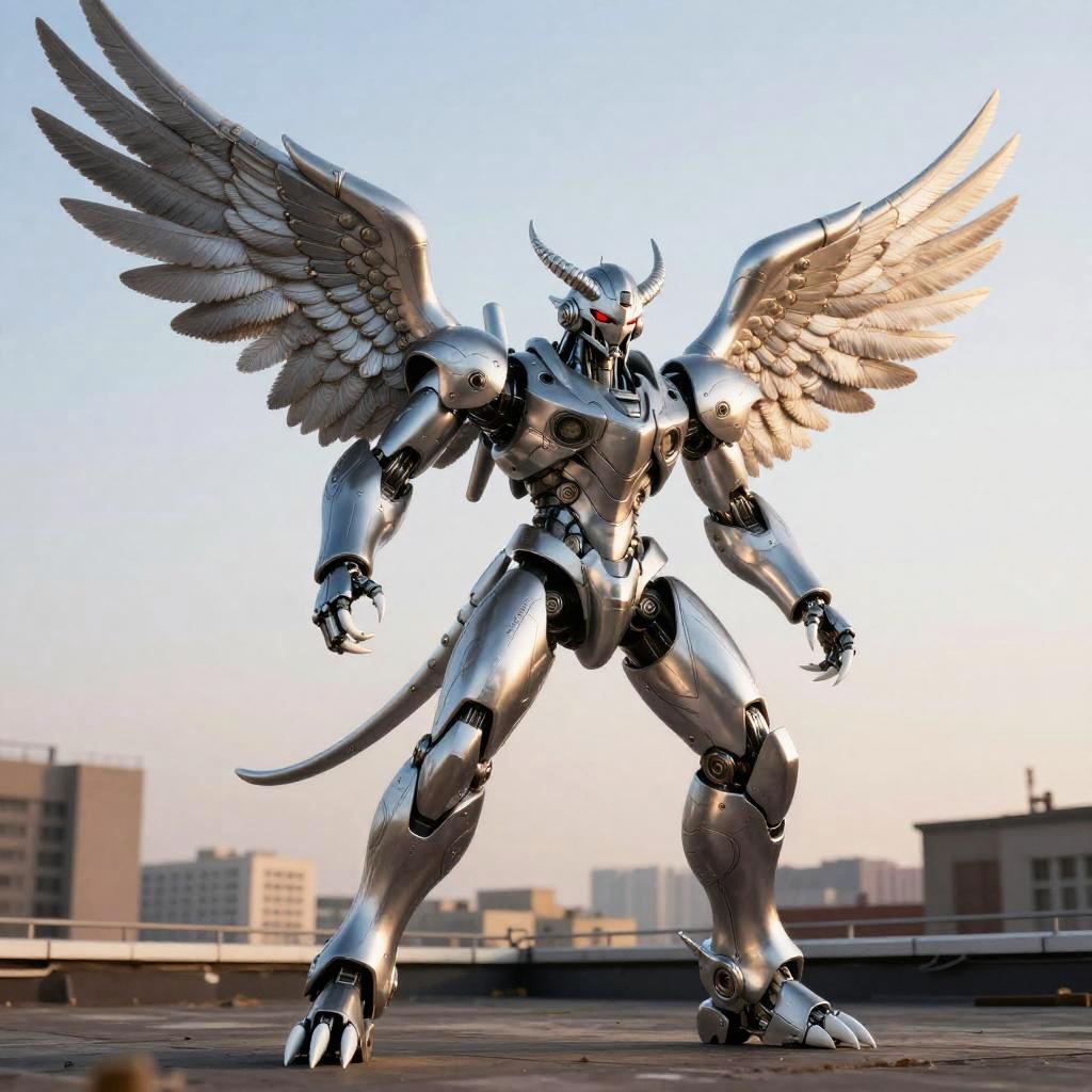 Silver Falcon Mecha Robot on Rooftop