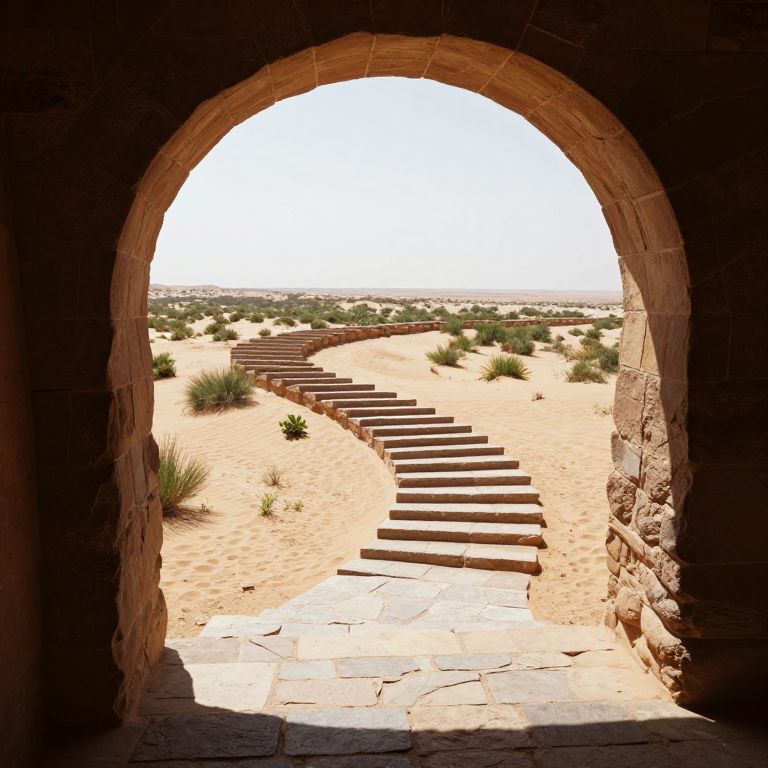 Spiraling stone steps ascend gracefully through a sunlit desert archway, curving towards a distant horizon while casting intricate shadows over sparse greenery and sandy terrain.