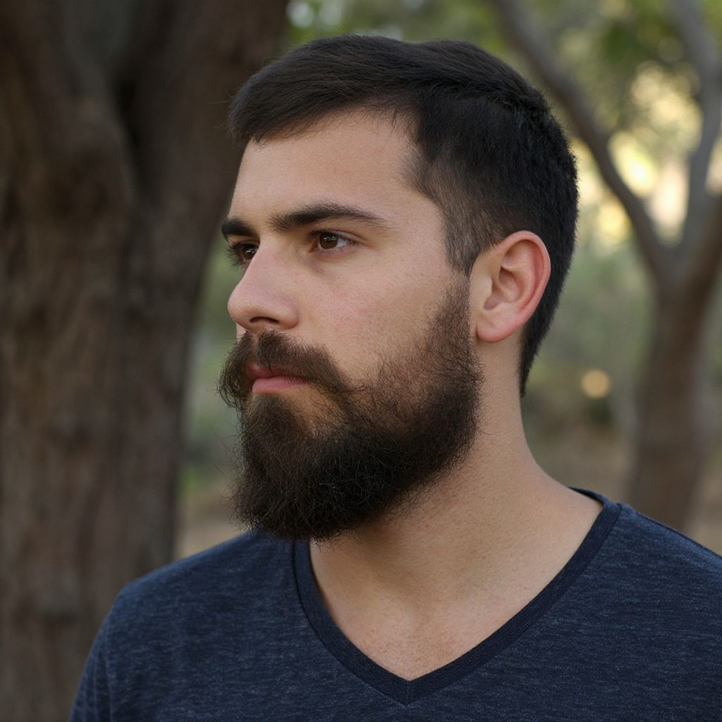 Tipo barba mid-shot of a young man with a thick, well-kept beard in a rustic outdoor setting, soft sunlight filtering through trees, natural skin tones, textured beard details, casual apparel, artistic photography vibe.