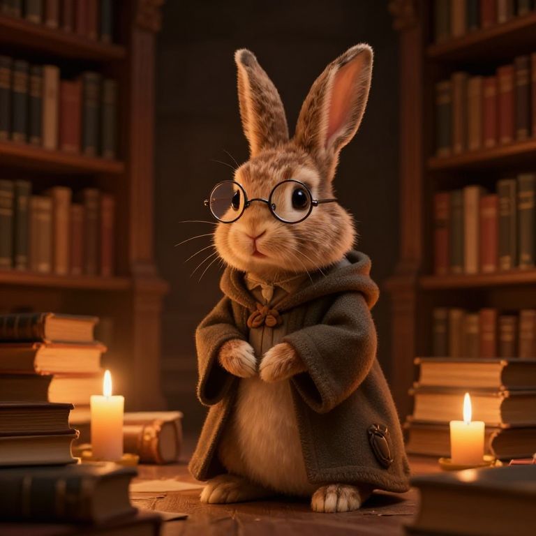 Bipedal rabbit scholar in an old library with towering bookshelves, wearing round spectacles and a cozy robe, surrounded by scattered ancient tomes and glowing candles, warm lighting creating a cozy atmosphere, delicate fur details and sharp eyes, storybook illustration style.