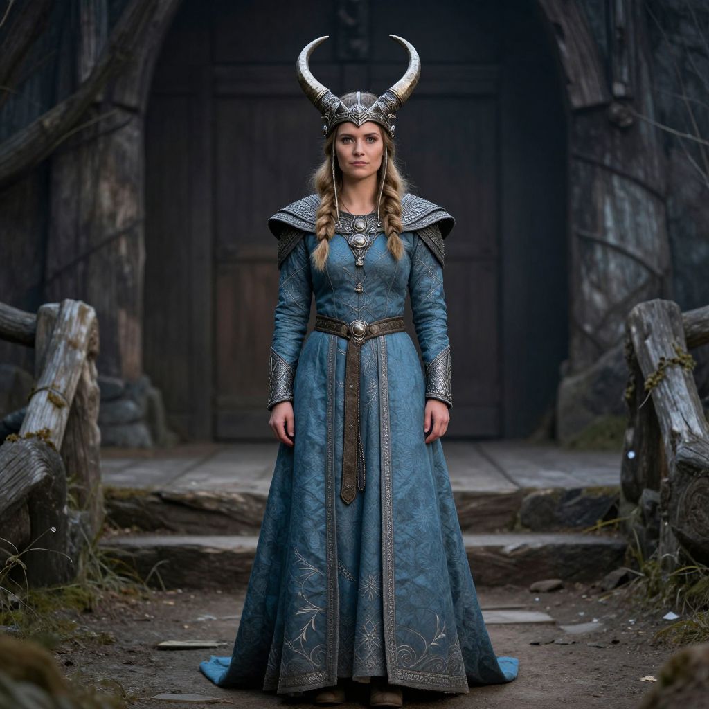Photograph of a young woman with fair skin and blonde hair in braids, wearing a medieval Viking-style blue dress with intricate silver embroidery and a brown leather belt. She has a silver helmet with large curved horns. The background features a dark, rustic wooden archway with twisted vines and a rough wooden fence on either side. The image has a fantasy, historical aesthetic with a dramatic, moody color palette. The woman stands centered, facing the camera, with a serious expression. The ground is stone with moss patches.