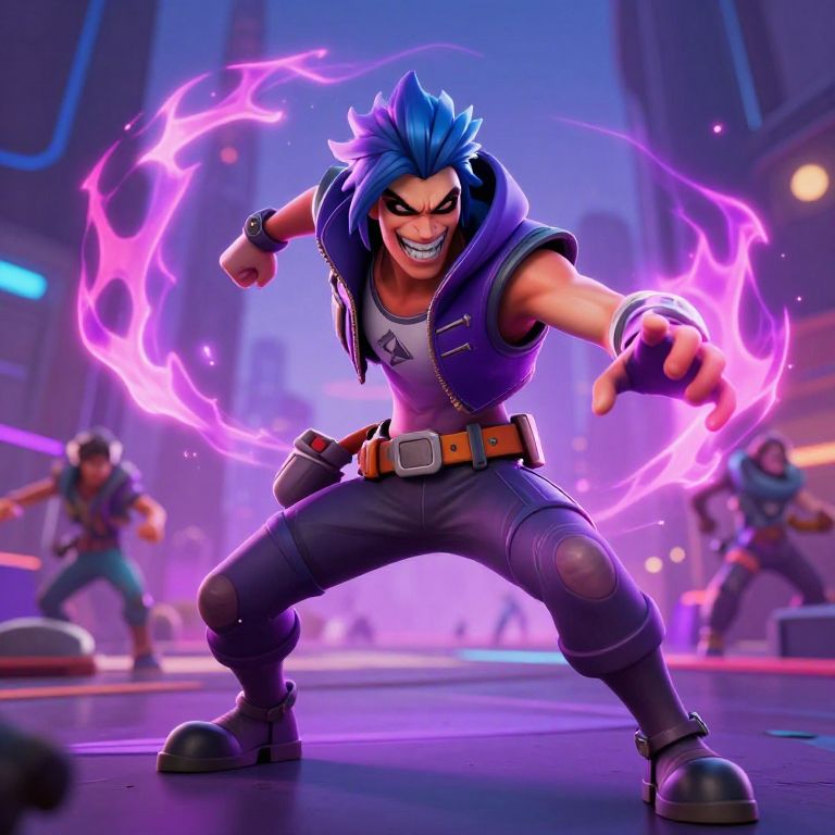 Grimace fortnite character in vibrant battle scene, dynamic pose with glowing purple and pink energy aura, futuristic urban background, high detail, sharp shadows, realistic textures, cinematic lighting