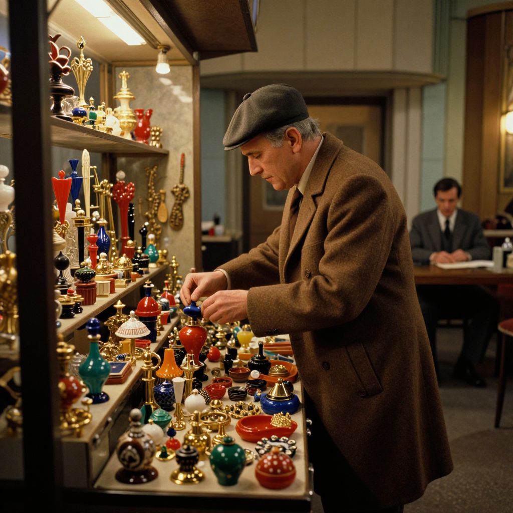 Photograph of an older man with fair skin and gray hair, wearing a brown overcoat and flat cap, meticulously examining colorful glass and metal trinkets displayed on shelves under warm, focused lighting. The man is in the foreground, slightly bent over, while a blurred figure in a dark suit sits at a table in the background. The shelves are filled with an assortment of vibrant glass bottles, brass figurines, and ornate jewelry. The setting appears to be an indoor shop or museum, with wooden paneling and soft ambient lighting enhancing the cozy atmosphere.