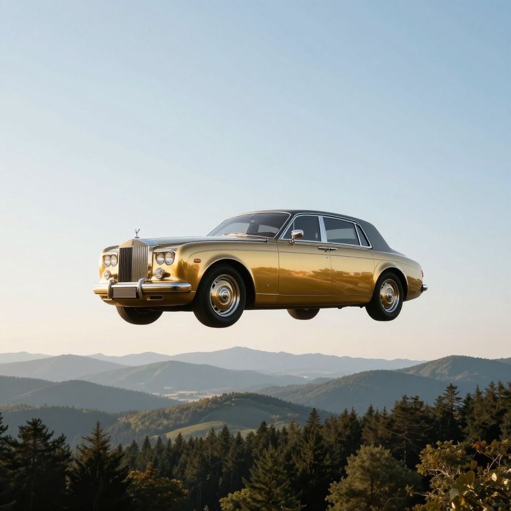 A photorealistic, weightless, reflective-gold-1926-Rolls-Royce-Phantom1 floating, unsupported, levitating, in the air, seen even higher in the sky, very much higher above the horizon, (very much much higher off of the ground, higher above the horizon, floating, much further up, wingless) very high up in the sky) far-far over the mountains and forest. the mountains abd forest are seen below the horizon and the reflective-gold-1926-Rolls-Royce-Phantom1 is seen well above the horizon so the mountains and forest are very-very-far below it..