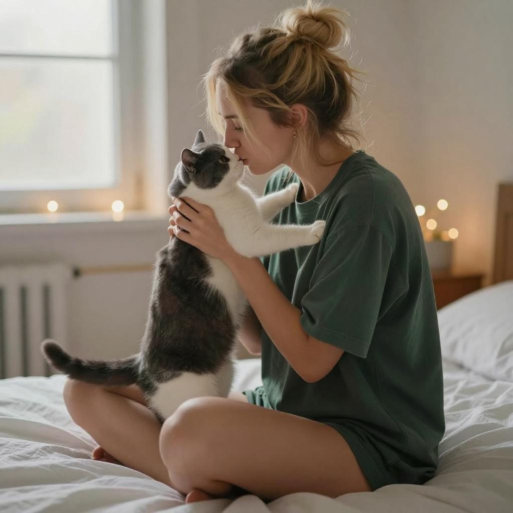 Photograph of a woman with blonde hair in a messy bun, wearing a loose, dark green t-shirt, sitting on a bed, kissing a gray and white cat. Soft, out-of-focus lights create a warm glow around them. She is seated with legs folded beneath her, cat held close to her face. Background is a softly lit window.
