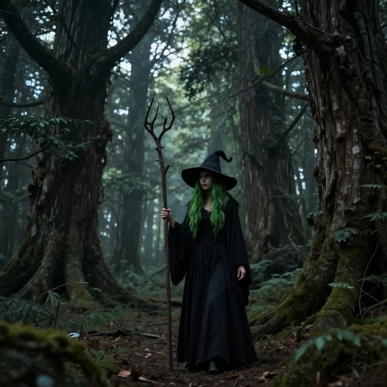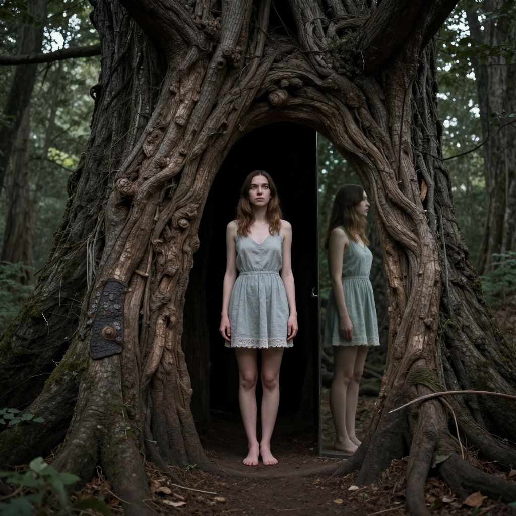Whispers emerge from a moss-covered tree hollow in a dense forest, where a woman in a dark gown stands hidden, her presence blending seamlessly with the ancient, sentient woodland.