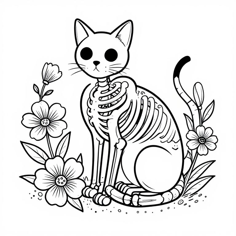 Pen Tool cat skeleton surrounded by flowers, style of a coloring book, black and white, vector lines,