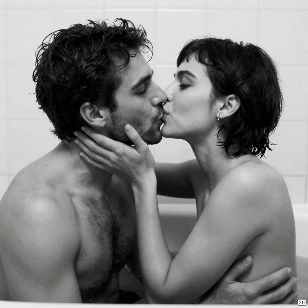 Black and white photograph of a nude man and woman kissing intimately in a bathtub. The man has dark, wavy hair, light chest hair, and a muscular build. The woman has short, dark hair, light skin, and a slender build. Both have their eyes closed, the woman's hand gently touching the man's face, while his arm wraps around her back. The background shows a tiled bathroom wall.