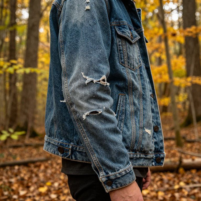 Fraying denim jacket sleeves worn by a rugged outdoors person standing in a dense forest during autumn, detailed textures of fabric wear and nature surroundings with warm golden light filtering through trees, showcasing rugged lifestyle and natural decay.