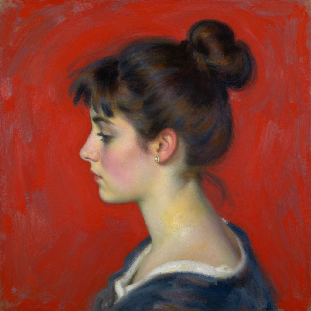 A striking digital artwork reminiscent of Pierre-Auguste Renoir's style, featuring a woman with dark hair styled in a bun, adorned with a subtle earring, set against a vibrant red background with textured brushstrokes, evoking a classic yet modern impressionist aesthetic.