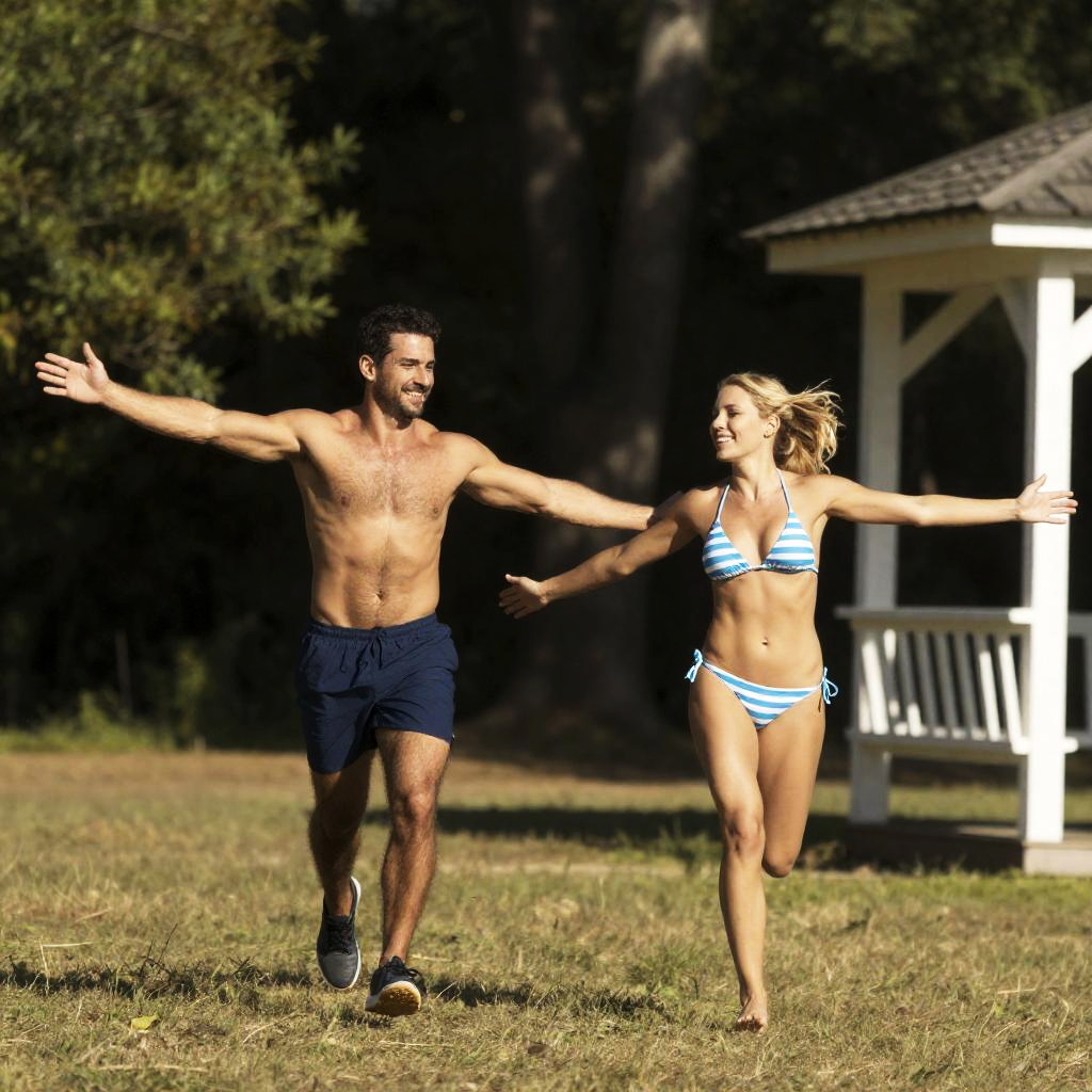 Photograph of a blonde woman and a muscular man holding hands. The woman wears a blue checkered bikini, the man wears dark blue briefs. Both are standing against a clear blue sky. The woman faces the man, both smiling. The man has a defined back and is slightly taller.