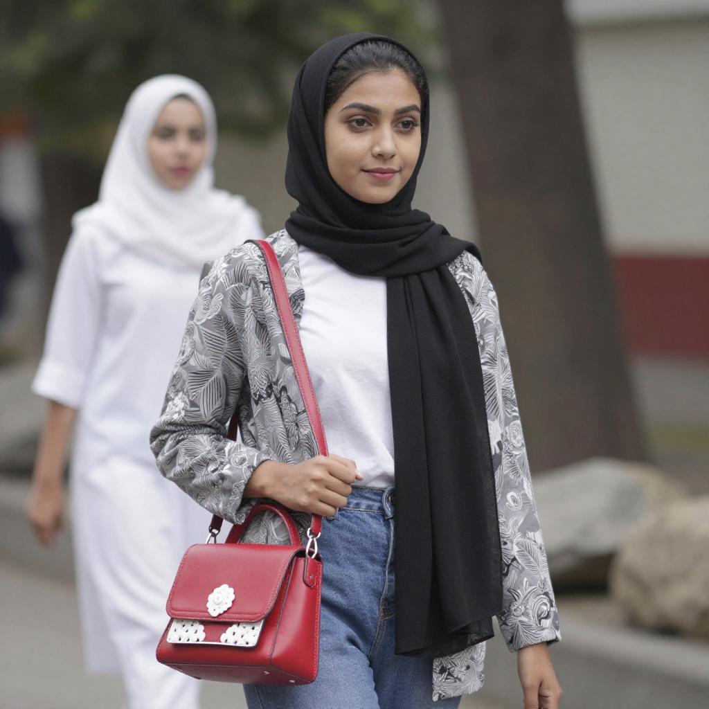 Photograph of a young woman with light brown skin and black hijab, wearing a white top, black scarf, gray patterned jacket, and blue jeans. She carries a red purse with white floral accents. She stands outdoors among rocks and trees, with another person in white clothing in the background.