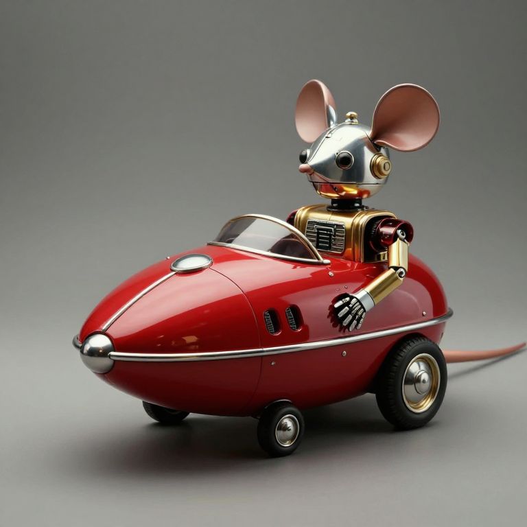 Photorealistic CGI of a shiny, red, futuristic mouse car with chrome details, large ears, and a robotic mouse driver, set against a gradient